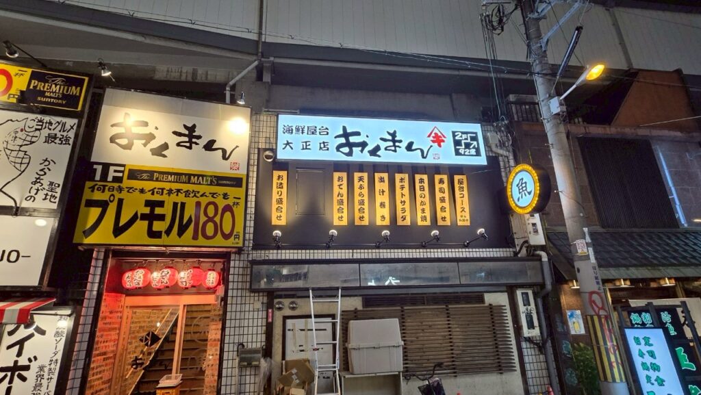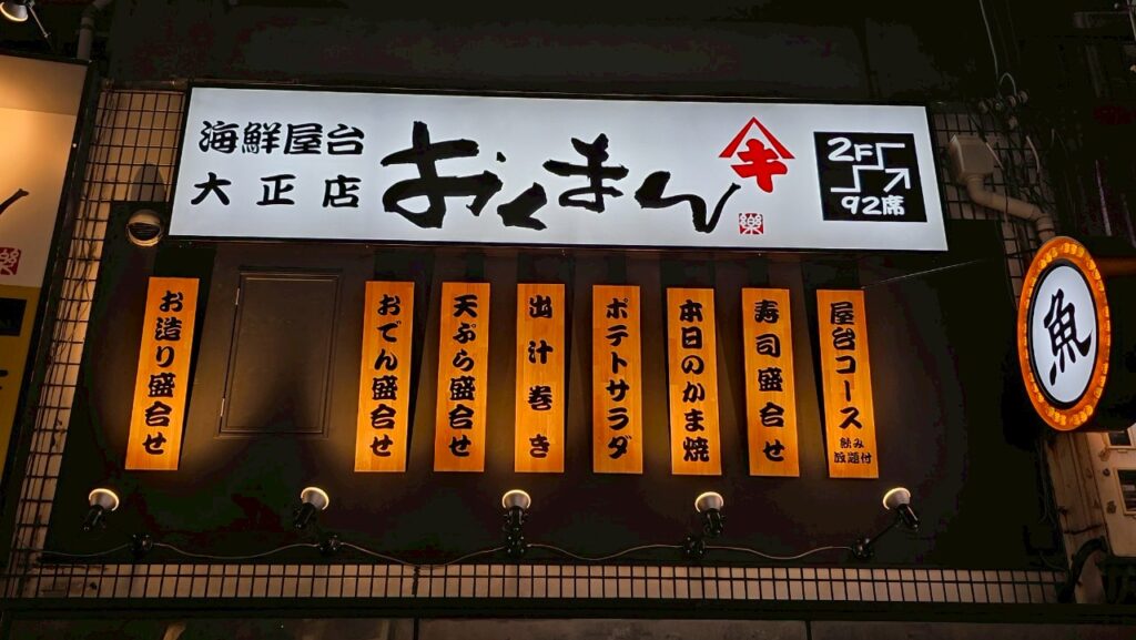 大正エリアの地域性を踏まえ、外観は親しみやすさと視認性を両立させる施工を行いました。夜間でも分かりやすい看板と照明を組み合わせ、初めての来店でも安心して入りやすい店舗構えとしています。